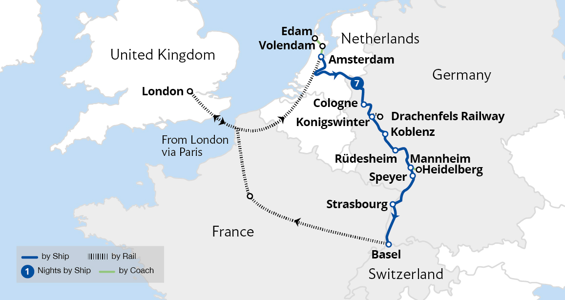 This beautifully scenic, relaxing cruise takes us to the towns and cities of the River Rhine. Sailing by enchanting landscapes, discover the landmarks of Cologne and enjoy a ride aboard the charming Drachenfels cog railway. Admire the Roman fortifications of Koblenz and Boppard before cruising through the sensational vistas of the...