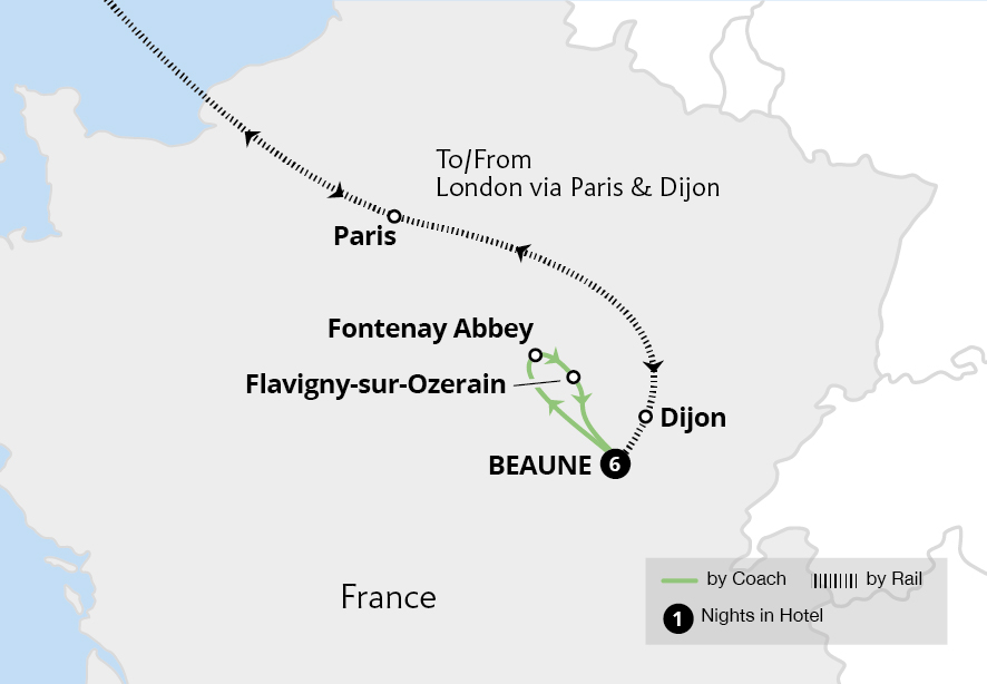 Leaving Beaune after breakfast this morning, we retrace our route to Dijon and travel to Paris by First Class rail. Boarding the Eurostar in Plus class, we enjoy a light meal enroute to London, where your walk and tour holiday comes to an end.