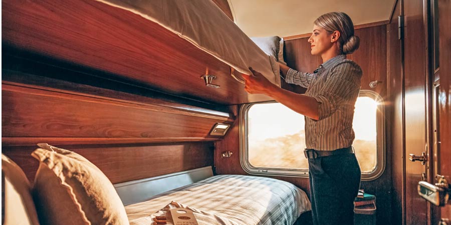 Relax in a private retreat in the Indian Pacific's Gold accommodations. These classic rooms feature everything travellers desire for a restful journey in the setup that best meets their needs. Guests can choose from Gold Twin cabins with a compact en-suite and upper and lower berths, Gold Single cabins with a lower-level single bed and in-room wash basin, Gold Access cabins thoughtfully designed for mobility-impaired guests, or spacious Gold Suites with a three-quarter-size double bed, an upper berth and an en-suite bathroom.